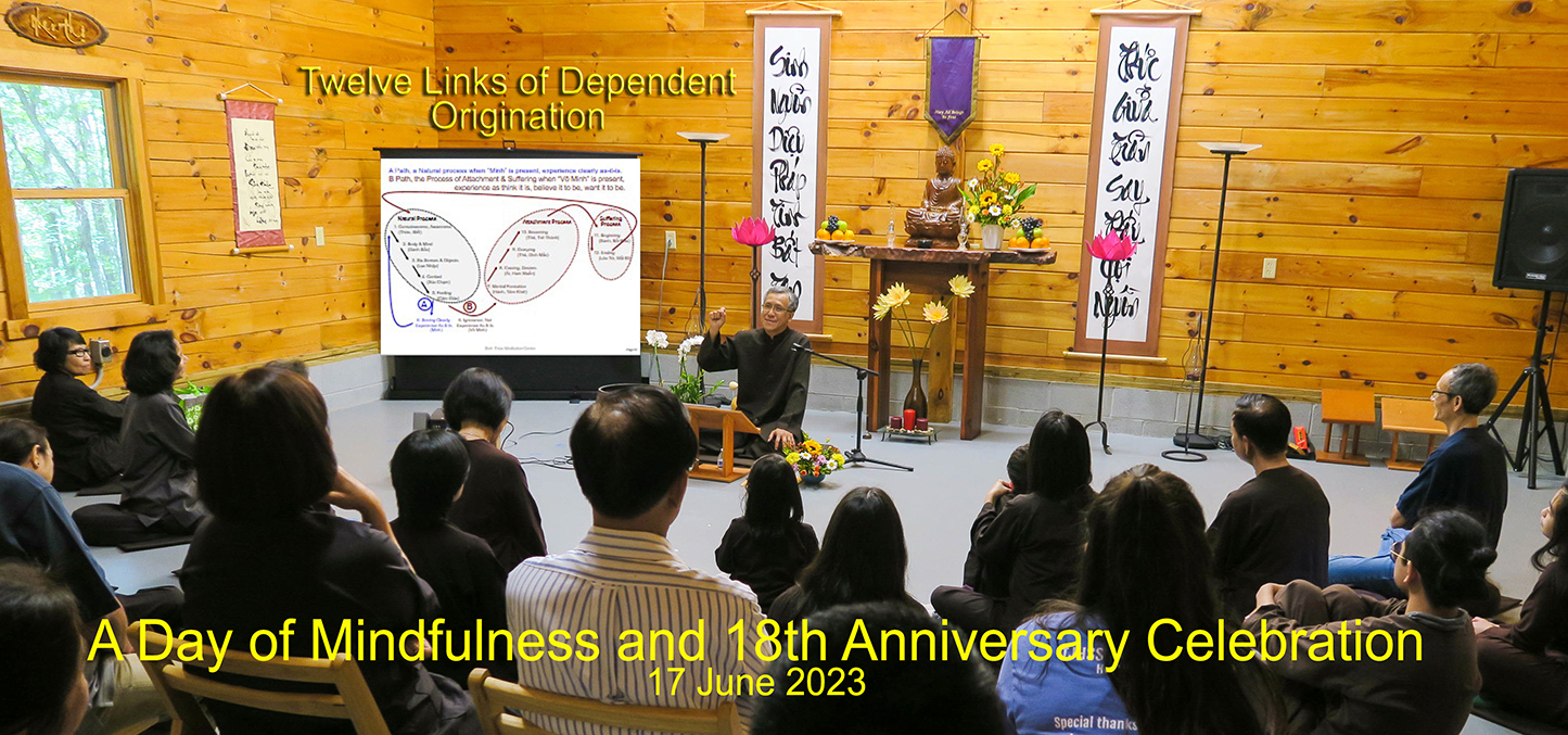 friendly, supportive environment. At this Special event, we will share with you the wisdom teaching on the Twelve Links of Dependent Origination (Thập Nhị Nhân Duyên, Paṭiccasamuppāda), the Process of Attachment leading to Suffering. The Wisdom teaching will not be presented in the traditional explanation of the cycle of rebirth (Vòng luân hồi) but on the practical moment-to-moment awareness of the process of Attachment (Vướng mắc) leading to Suffering (Khổ đau). The Teaching talk will share the closely connected conditions (Duyên khởi) such that one can clearly see the differences between the process of the Cloudy mind (Vô Minh) and the natural process of the human experience (Quá trình tự nhiên) based on awareness and feelings. The Day agenda will be structured with a balance of teaching talk, outdoor meditation, storytelling, wellness exercises, group discussion, Q & A, relaxing time and festivities celebration. ![]() | ||